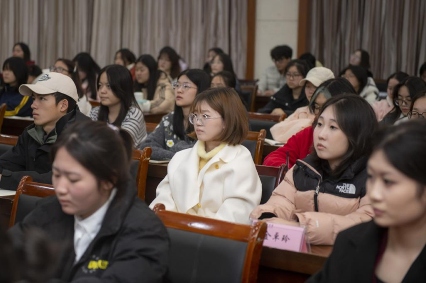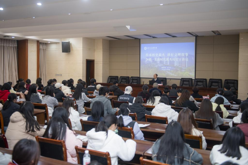 黄涛带领同学们一同回顾了学校两次艰难的创业历程,并围绕学校办学精神的生成与内涵以及学校近年来学科发展、人才引进、市校合作等方面的做法和成效,引导同学们进一步深化对学校校史和精神谱系的理解。他指出,在学校近半个世纪的高等教育办学历程中,特别是在塔石路创业的21年来,孕育形成了以“受命不迁,忘我工作;勤学笃行,躬耕教坛;服务区域,城校共兴;守正创新,追求卓越”为主要内涵的“塔石精神”。这一精神源于“艰难困苦、玉汝于成”的办学传统,体现在广大教师和干部的默默坚守和无私奉献,成就于厚德笃行、博文大理的教育事业,凝结于爱校建校、强校报国的文理情怀,是学校践行新时代教育家精神、科学家精神的实践载体,也是学校新时期办学精神的集中体现,更是文理人独特的精神标识。他希望同学们在今后的学习生活中做“塔石精神”的传播者和实践者,以实际行动表达爱校荣校兴校的使命与担当.黄涛希望大家要树立“大宣讲”格局,在准确把握校史核心内容的基础上,做到“讲宣结合、讲学结合、讲悟结合、讲践结合、讲练结合”,既要用鲜活事例与真情实感讲活校史故事,以“小切口”解析“大道理”,更要在学习中深化理解,在实践中传承精神,早日成长为一名有深度、有温度、有担当的新时代优秀校史宣讲员。